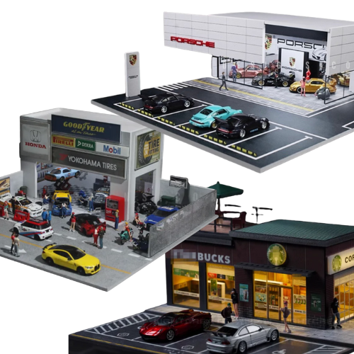 SHOP NOW1/64 Car Model LED Dioramas by Aventi Designs, Featuring city buildings, restaurants, mechanic shops, stores, and car dealerships. Awesome design, great quality, and perfect to show off your collection.